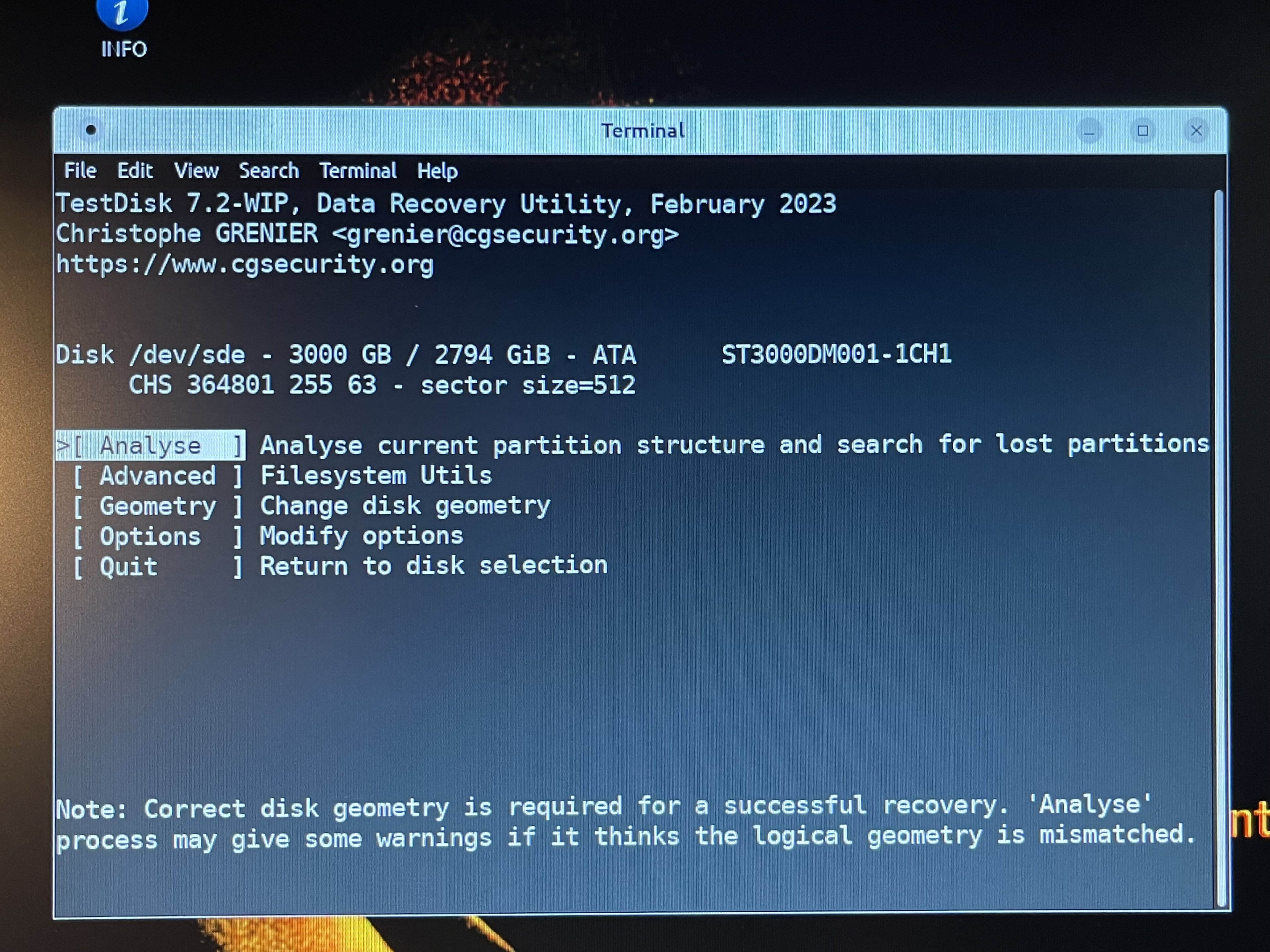 Durch suchen hier im Forum und anderweitig bin ich auf testdisk gestoßen, um ggf. die GBT zu reparieren. testdisk zeigt die HDD aber gar nicht an, im Handbuch steht dann: