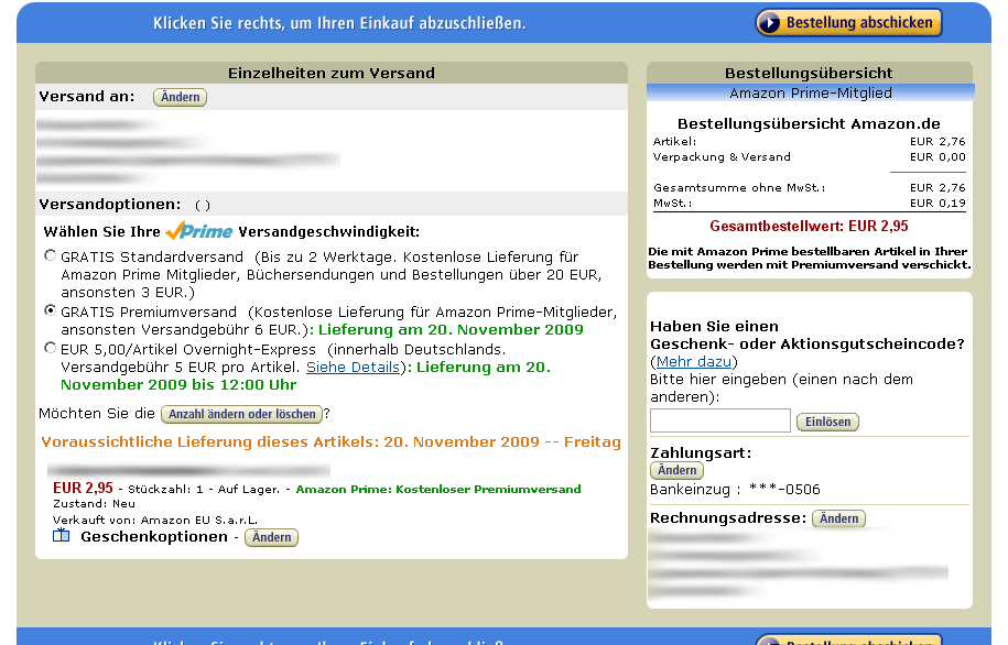 Jetzt bestelle ich gerade 3 CDs, alle direkt von Amazon und auf Lager angegeben, also ohne den genannten Zusatz oben und dann komme ich aus dem Staunen nicht mehr heraus als ich beim Abschluss der Bestellung lesen muss, voraussichtliches Lieferdatum kommender Freitag, den 20.11.09. Ich muss dazu sagen, dass ich Amazon Prime Kunde bin. In der Vergangenheit hätte diese bedeutet, die Lieferung hätte mich am Donnerstag erreicht. Hätte ich vor 16 Uhr bestellt, sogar schon am nächsten Tag. Und jetzt soll ich bis Freitag warten trotz zusätzlicher 29€ im Jahr für die Prime Mitgliedschaft!?