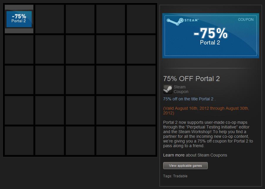 habe im Steam einen Gutschein über "75% auf Portal 2" erhalten, habs aber selber schon.