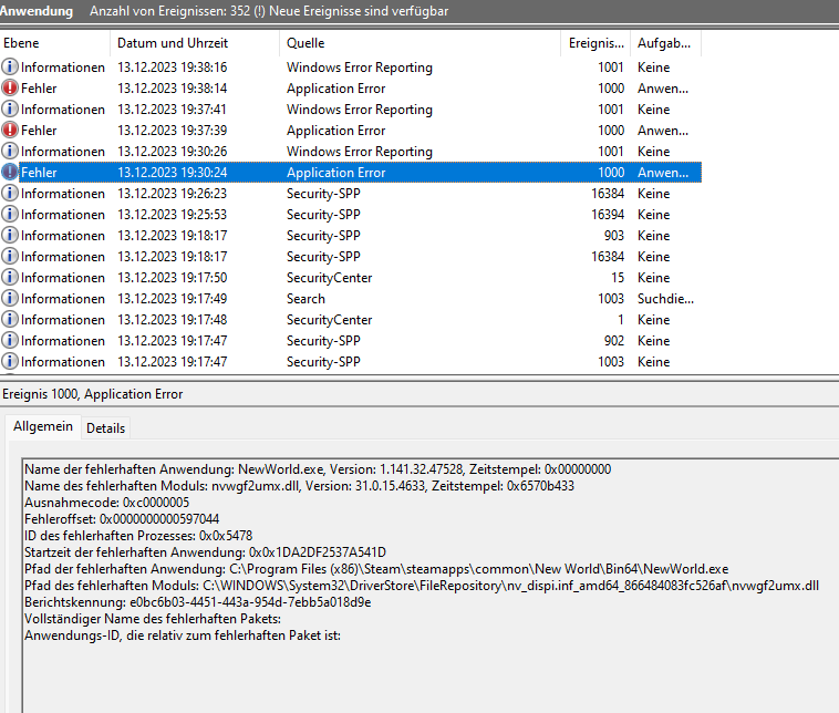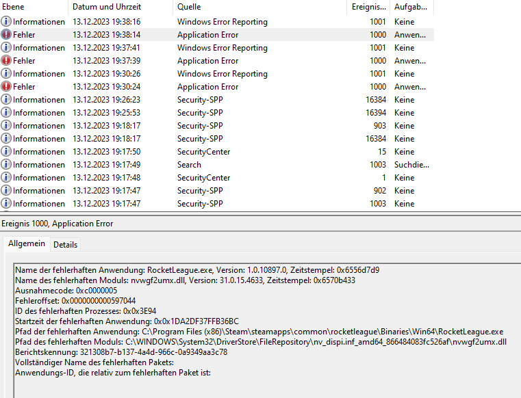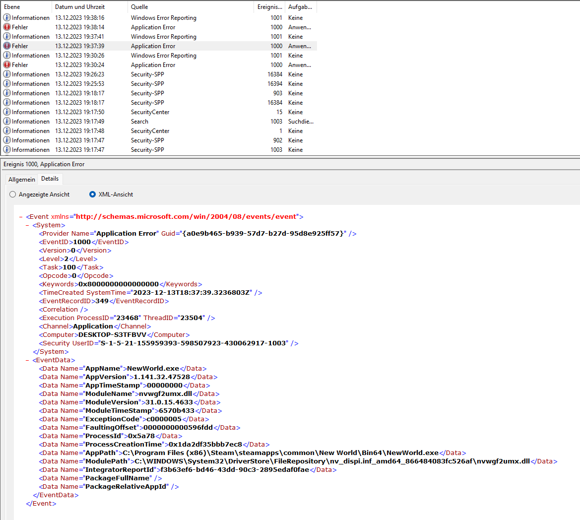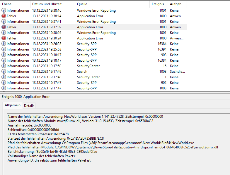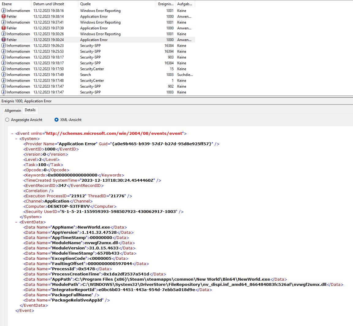 Mittlerweile gibt es aber auch Fehler in der Ereignisanzeige. Hier mal die Details: