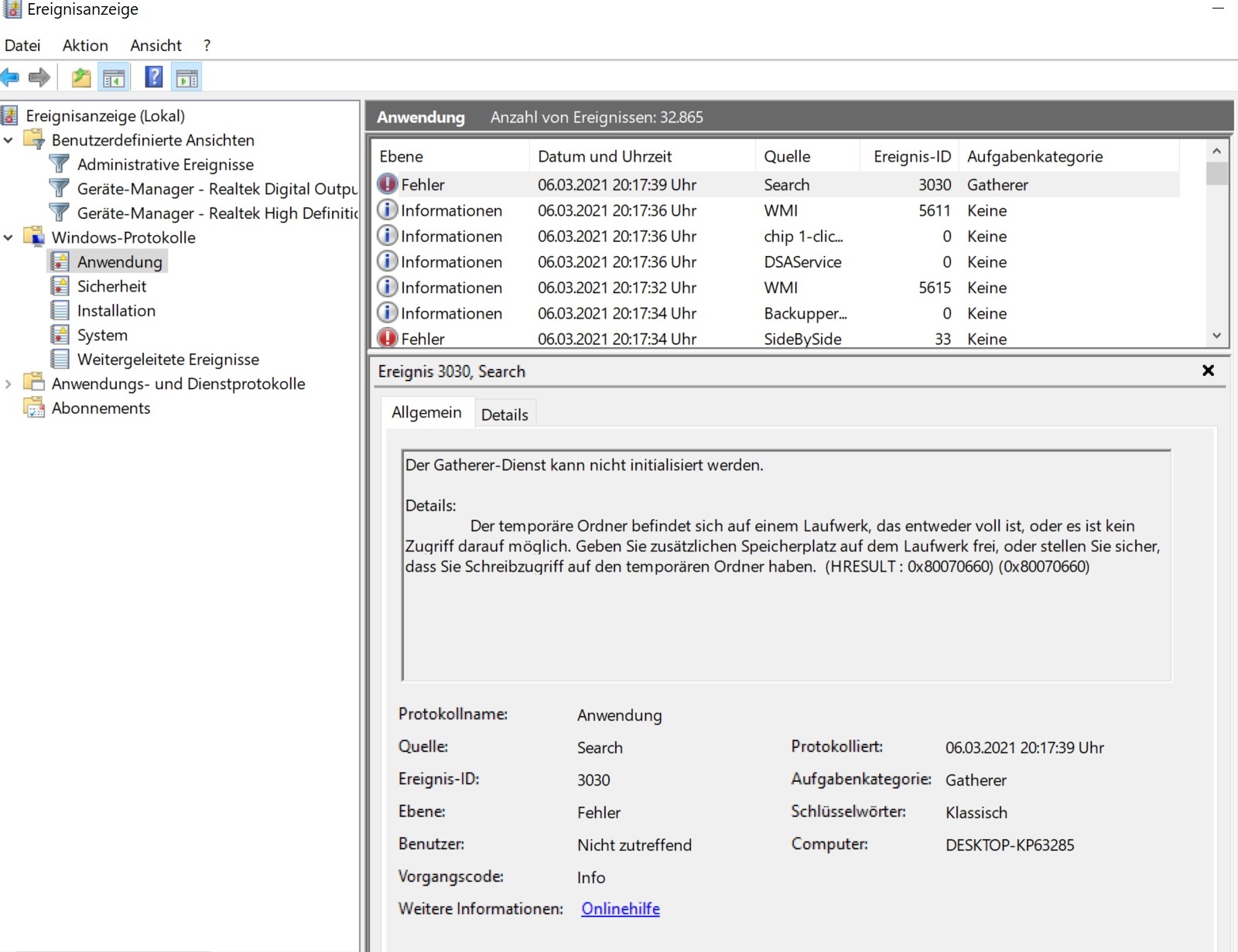 Die Ereignisanzeige erwähnt in dem Moment einen mir unerklärlichen Fehler aufgrund „Speicherplatzmangel temporärer Ordner“(s.Bild). Solche mp4-Downloads sind aber immer abgeschlossen und funktionieren dort auch z.B. beim Durchtracken/Abspielen (ob wirklich 100% kann ich allerdings nicht sagen, weil ich es dort nicht immer ausprobiere).