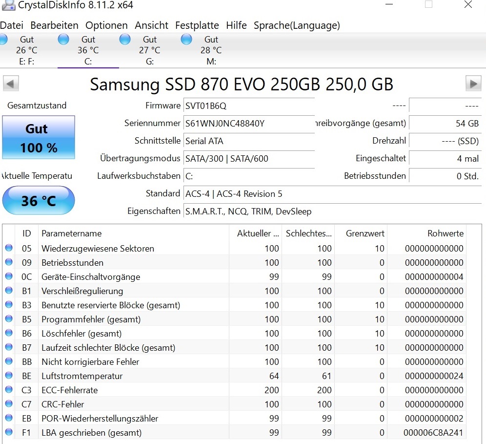 ja, für rd 60,- gibt es die 870EVO (500GB) aber auch. Wenn eine SSD garantiert 10J halten würde, hätte ich eine solche 500GB wohl gekauft. Mein “C” belegt gerade mal 60GB und wird kaum mehr werden (=rd 25% bei 250GB).