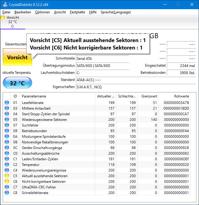 Im Crystal Disk erhalte ich nun aber eine Warnung für diese HDD.