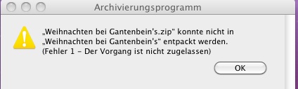 Ich habe zum Test 71 Fotos in ein .zip File gepackt und dieses dann auf dem Mac versucht zu öffnen. Leider erhalte ich die unten, im Bild stehende Fehler Meldung....