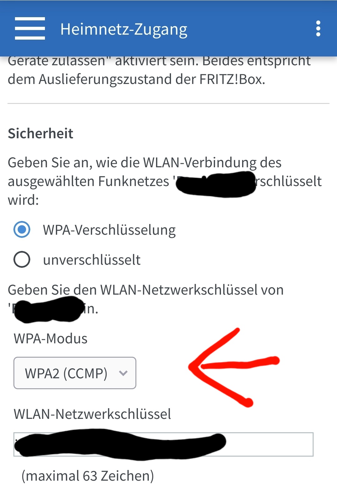 Dort kannst du die Verschlüsselung zum Host auf nur WPA2 ändern. Ich kann dir aber nicht sagen, ob dafür die "Einstellungsübernahme aktiv" an oder aus sein muß. Ich habe sie deaktiviert.