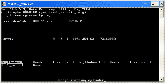[ Cylinders ] [ Heads ] [ Sectors ] [ Cylinders ] [ Heads ] [ Sectors ] [ Typ ] [ Done ]