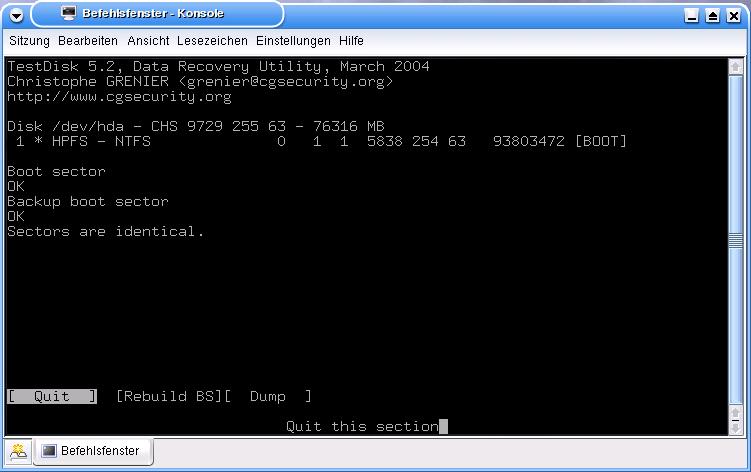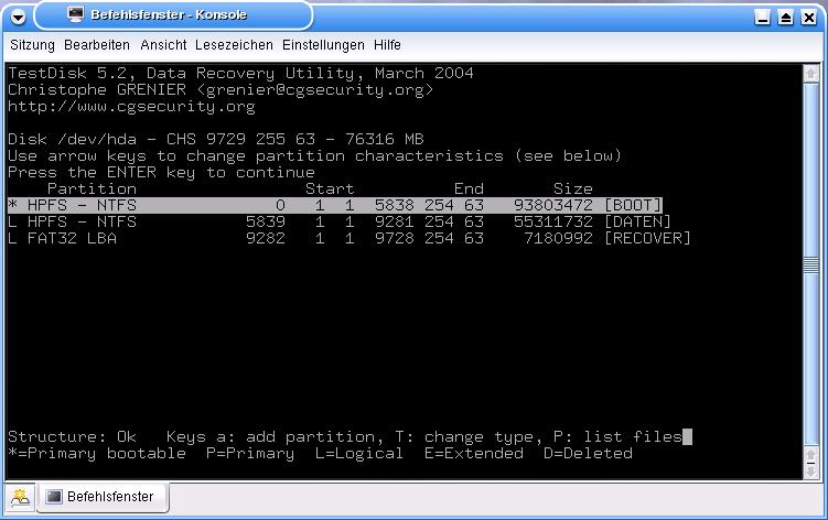 Dann lief die kleine Platte nicht mehr, und ich hab auf der großen eine 10er Partition erstellt, und da das Betriebssystem draufgespielt, damit ich den Rechner überhaupt starten/nutzen konnte (inzw. hab ich rausgefunden, das die Fehlermeldung am Datenkabel lag) daher auch meine Vermutung, das, wenn überhaupt noch Daten da sind, sich diese in der Partition von 1275 bis 9728 -so wie die Platte jetzt aussieht- befinden, da auf der anderen ja durch das Aufspielen vom Betriebssys. ein Schreibvorgang stattgefunden hat.