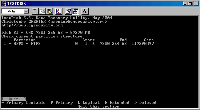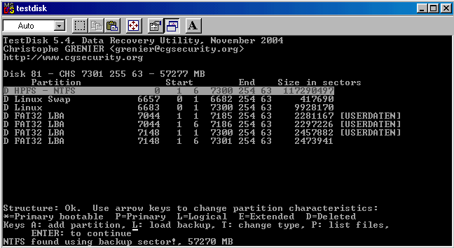 Zur Wiederherstellung der NTFS-Partitition via Testdisk geht es mir darum eine Verbindung zu Grub auszuschließen und auf Standard wiederherzustellen mit Startsektor 1 und zu überprüfen.