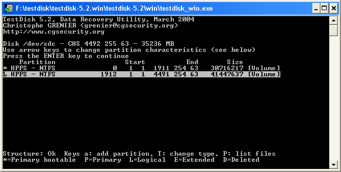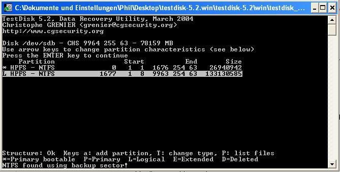 Ich gehe also in TEST DISK rein, wähle die 80 Gb platte aus, dann auf ANALYSE, und nun steht dort :