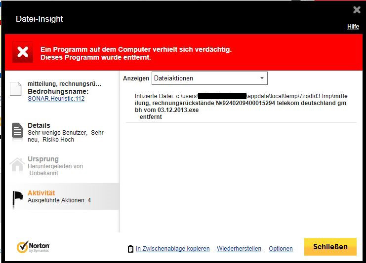 Norton 360 hat auch gleich mit rotem Alarm gemeldet, daß eine große Gefahr besteht und hat das Ding beseitigt und mich zum Neustart aufgefordert.