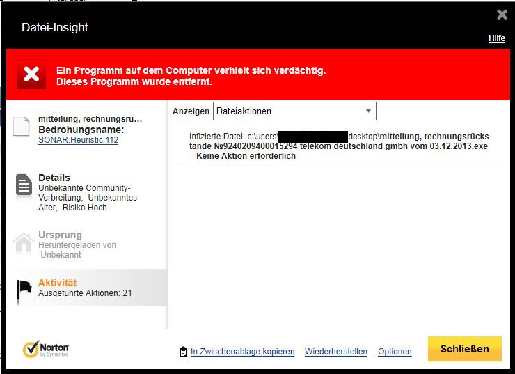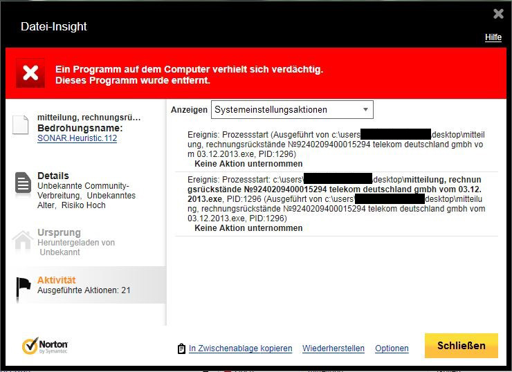 Infizierte Datei: c:\users\username username\desktop\mitteilung, rechnungsrückstände №9240209400015294 telekom deutschland gmbh vom 03.12.2013.exeKeine Aktion erforderlich