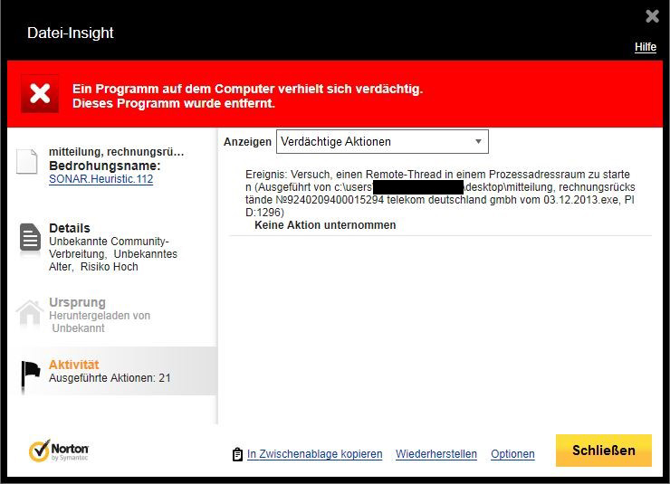 Ereignis: Versuch, einen Remote-Thread in einem Prozessadressraum zu starten (Ausgeführt von c:\users\username username\desktop\mitteilung, rechnungsrückstände №9240209400015294 telekom deutschland gmbh vom 03.12.2013.exe, PID:1296)Keine Aktion unternommen