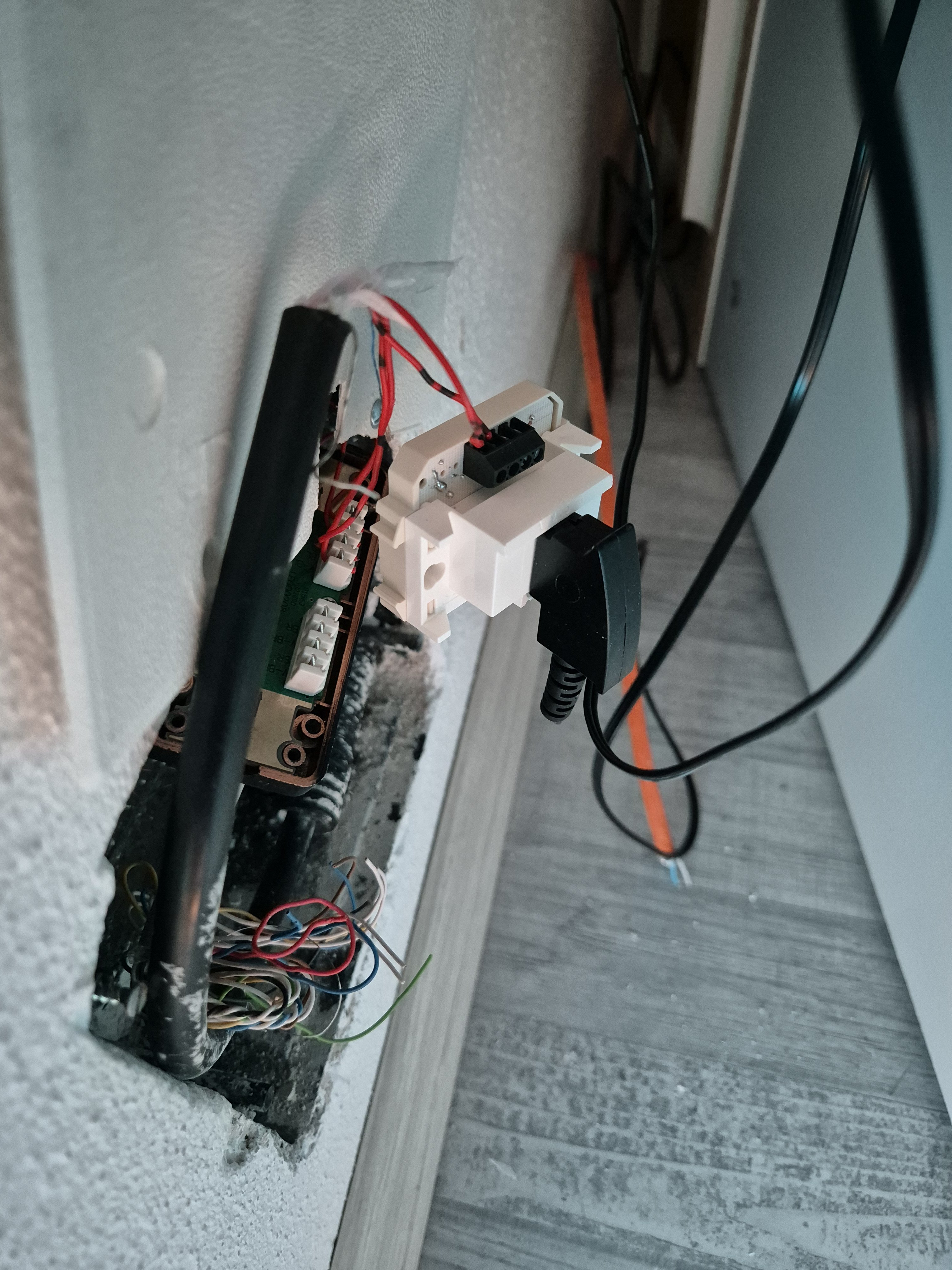 Anbei ein Foto wo man das schwarze Kabel sieht, hab die zwei Drähte jetzt einfach nur an die TAE angeschlossen anstatt über CAT7 zu verlängern. Wie gesagt, der APL sitzt außerhalb (ca. 5m Luftlinie) an einem Masten. Bei uns kommt noch teilweise das Kabel oberirdisch.