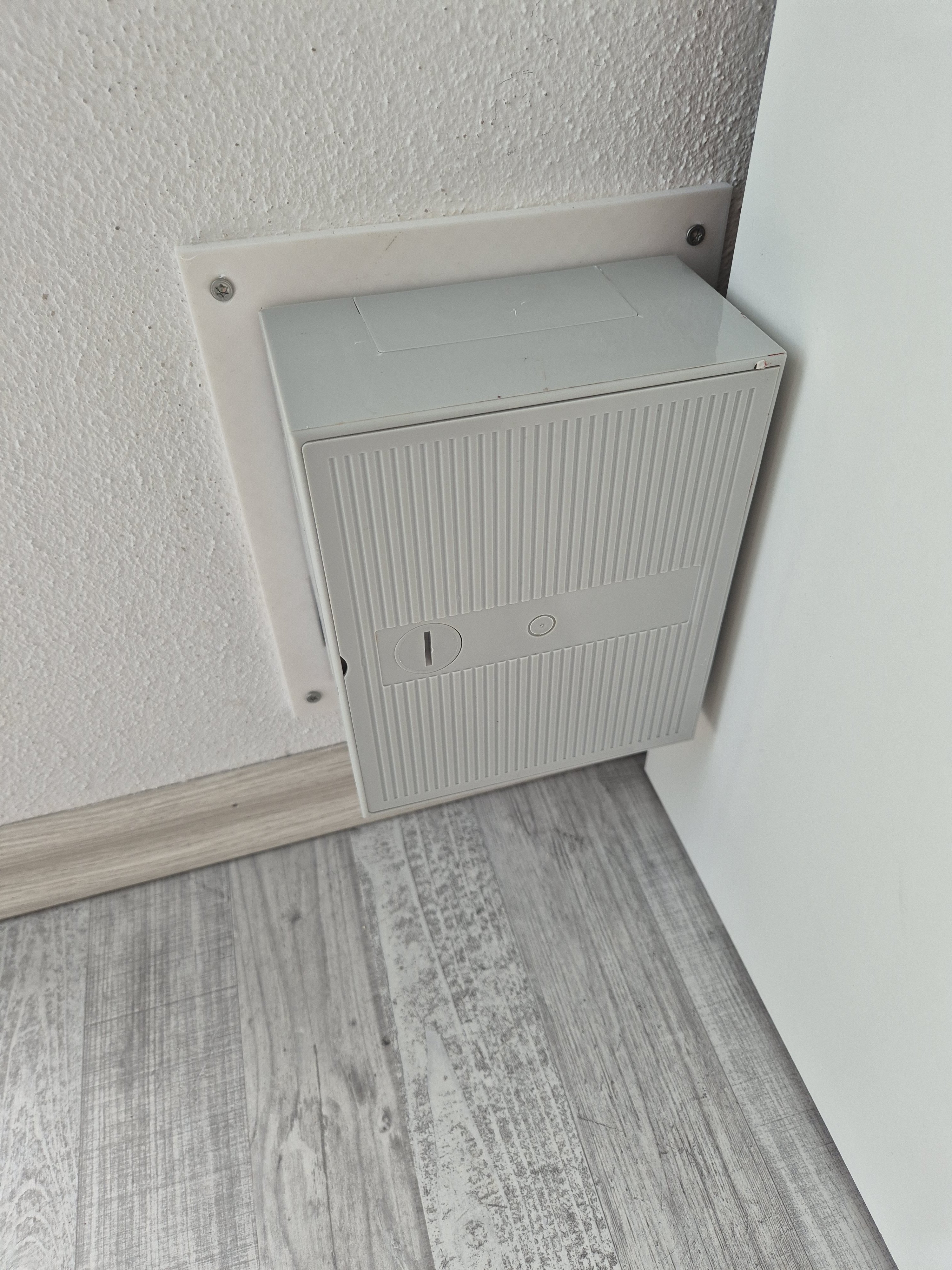 Anbei auch nochmal zwei Fotos von dem Kästen das ich jetzt vor das Loch an der Wand geschraubt habe und die Telekomkabel nach innen gelegt habe... Das Kästchen gewinnt zwar keinen Schönheitspreis, aber erfüllt seinen Zweck und es ist ordentlicher.
