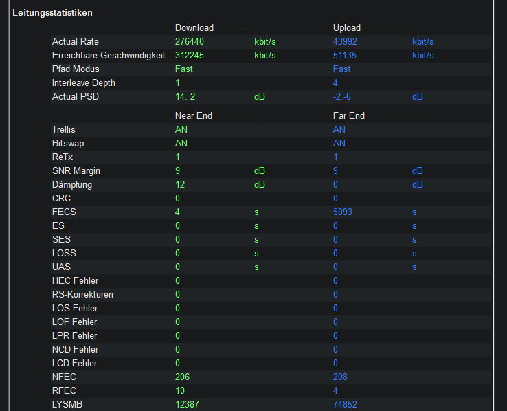 Anbei auch nochmal ein aktueller Speedtest und die Leitungswerte. Wobei beim Draytek die Uploadseite erst alles auf 0 gesetzt wird, wenn der Telekomkasten draußen an der Straße mal "neu startet". Da summieren sich die Fehler auf und werden bei einem Neusync seitens des Routers nicht zurückgesetzt.