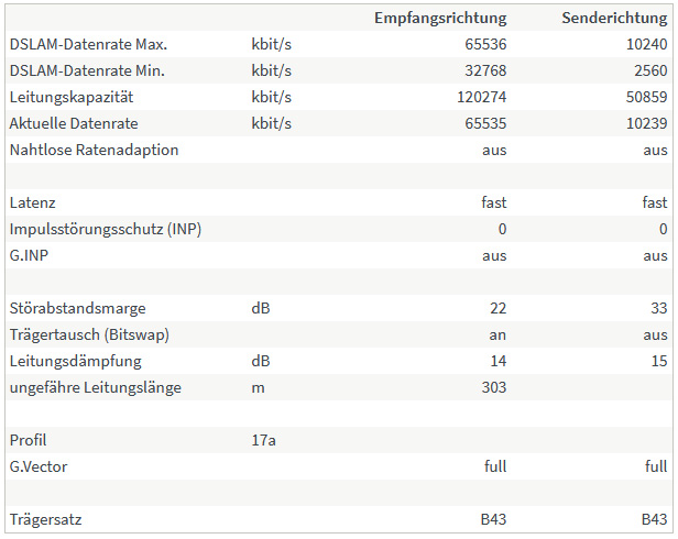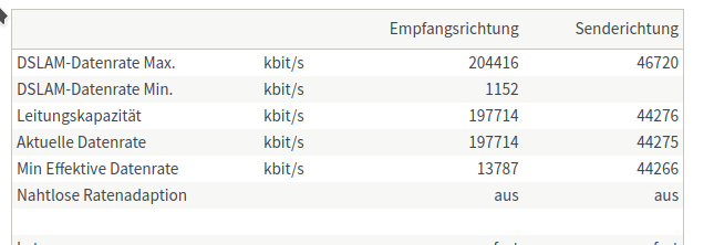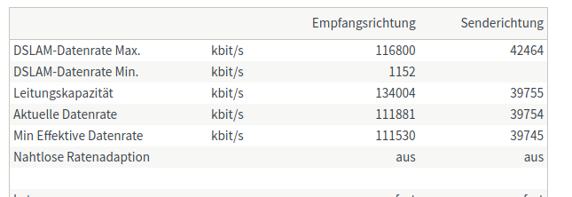 Die Fritzbox sagt mir, dass eine Leitungskapazität von knapp 73Mbit anliegt. Von denen bekomme ich etwas über 60 bei bezahlten 50. Soweit so schön natürlich.
