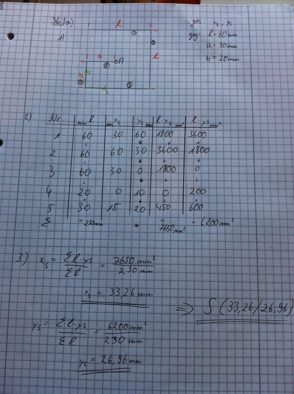 a) Berechnen sie die Lage des Schwerpunktes des dargestellten gebogenen Drahtes für die x-Achse und die y-Achse.