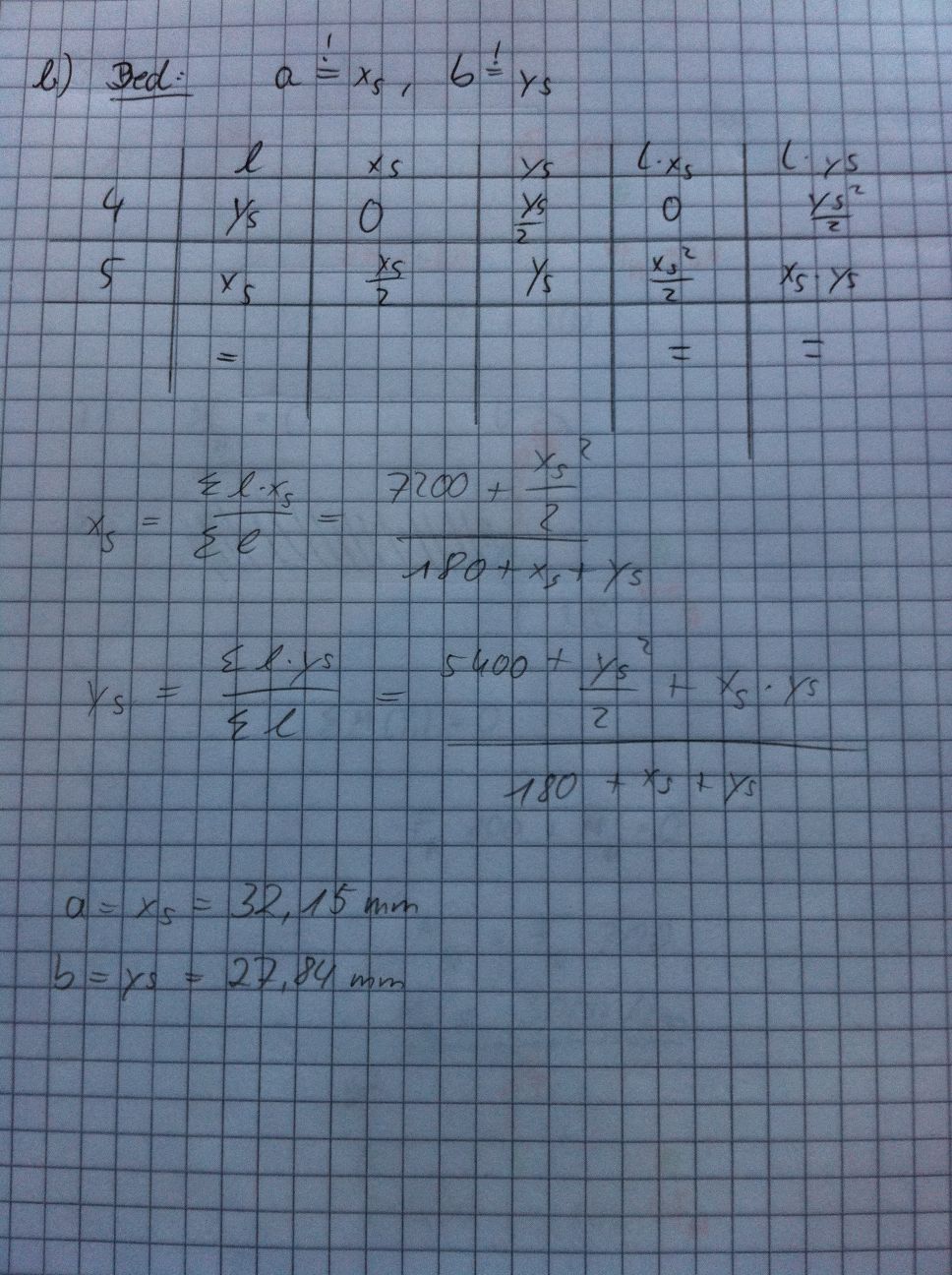 b) Variieren sie a und b solange, bis der Schwerpunkt mit der Aufhängung in A zusammenfällt. Benutzen sie ggf. den "Solver" in einem Tabellenkalkulationsprogramm.