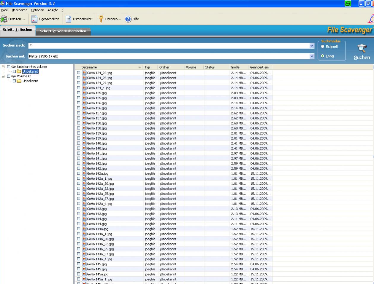 Im 2 = Volume K ebenfalls ein Unterordner unbekannt - hier wiederum sehr viele Dateien. Diese hatten aber leider alle den Namen Unbekannt001, 002 usw. - der Status jedoch war gut.