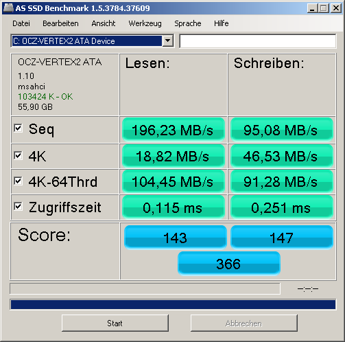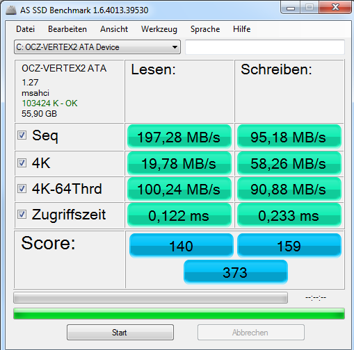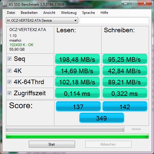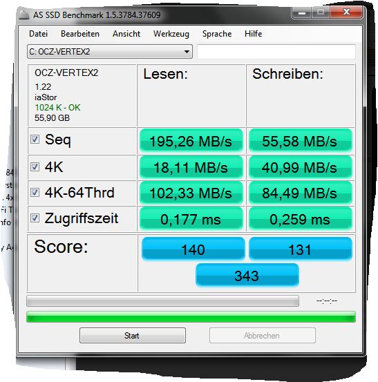 Testes einer Vertex 2 120 GB. Unterschiede von 75 Punkten auf dem gleichen System und 124 Punkten bei unterschiedlichen Systemen, Notebooks sind hier wahrscheinlich stark betroffen, führen zu einer schlechten Vergleichbarkeit unter den gegebenen Umständen.