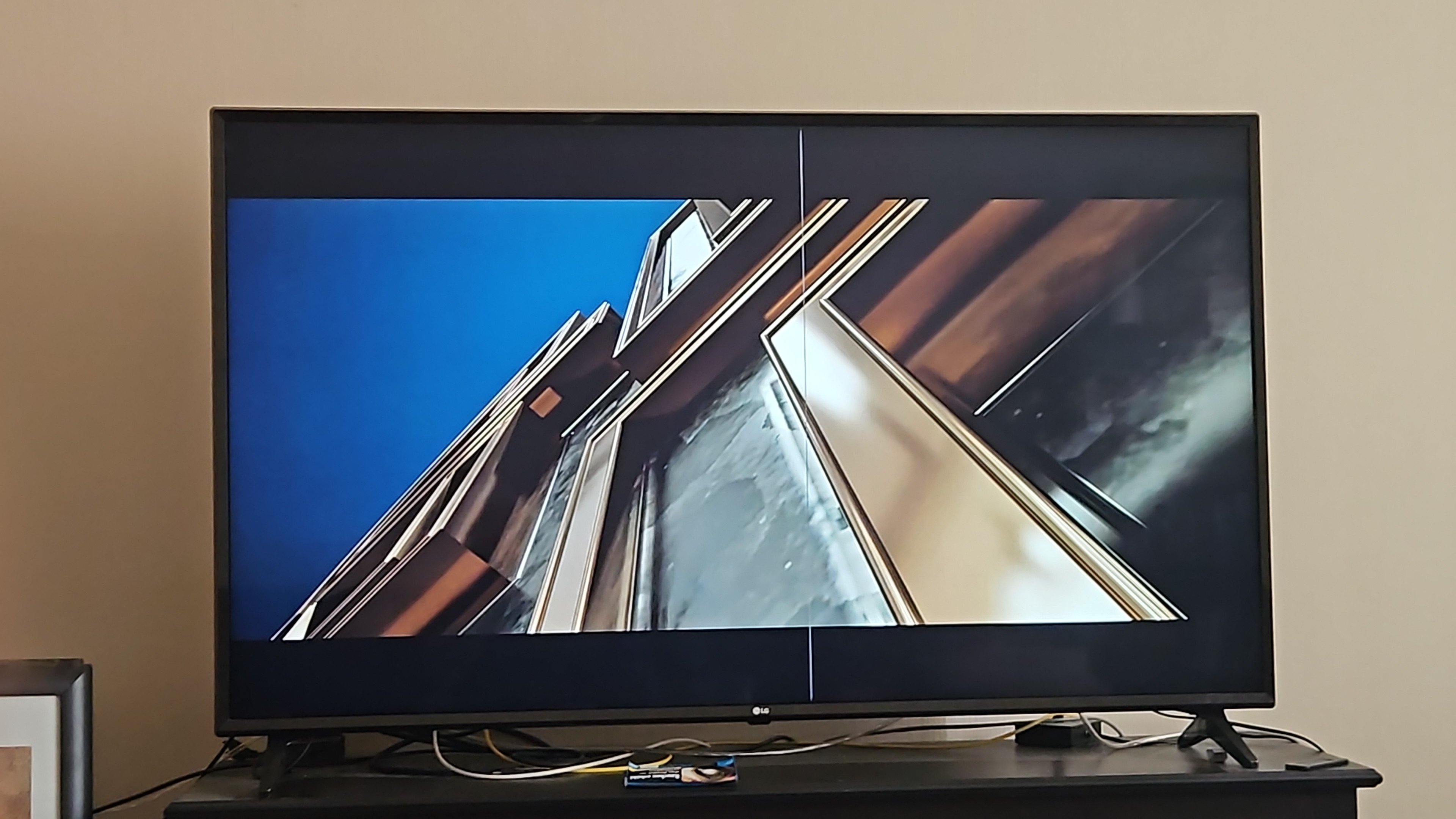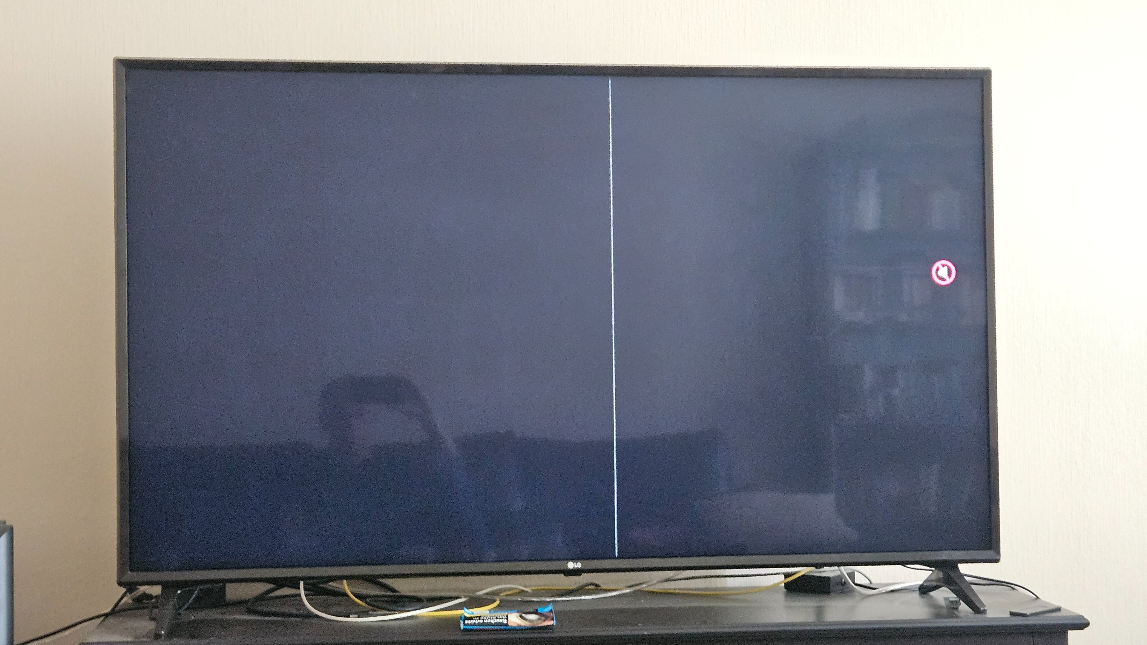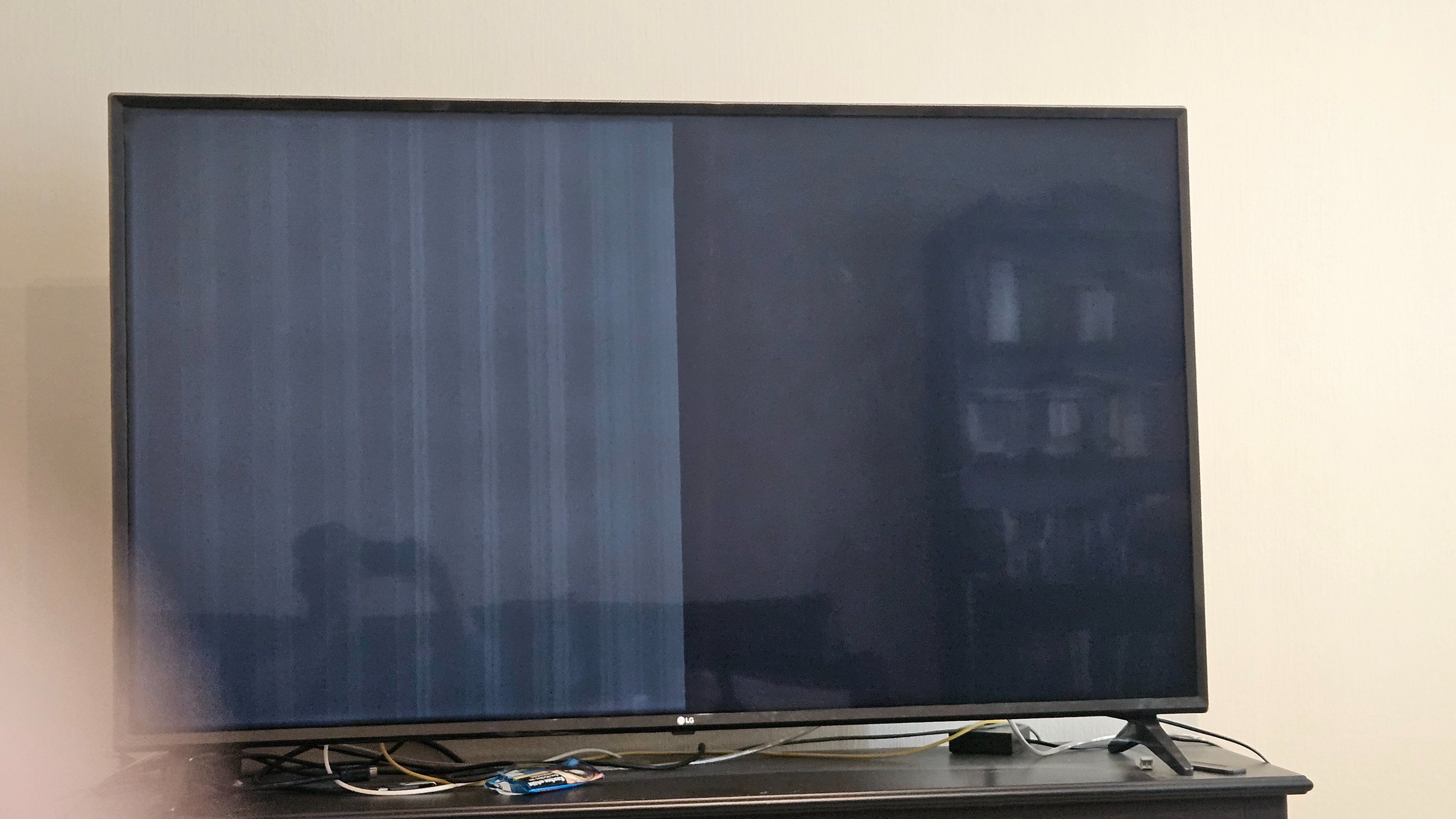 Modell ist ein 60UJ6309 von LG, soweit so gut. Nachdem ich ihn das erste Mal aufstellte, hatte ich wohl ein Flachkabel nicht richtig drin. (Bild 1).