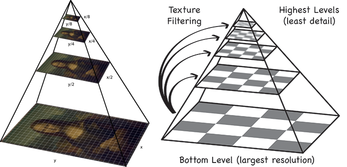 Edge-detect-Algorithmen des Anti-Aliasing – gleich welchen Charakters – aufgrund der geringeren Komplexität einer kleineren Stufe des Mip-mapping deutlich weniger Zeit und Rechenlast erfordert, als es die originale Texture täte. Gleiches gilt für verringerte Algorithmen-komplexitäten der anisotropen Filterung.