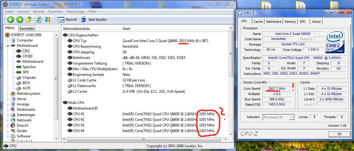 Nun habe ich im Bios den FSB auf 366 Mhz gesetzt und den Multi auf 8, das ergibt doch dann eine FSB von 1464 und nen CPU Takt von 2928 Mhz !