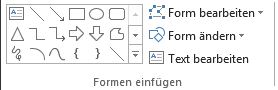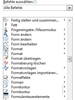 Also dachte ich mir, dann versuche ich es über Formen kombinieren. Diese Möglichkeit wird aber im Menü nicht angezeigt. Also über Menüband anpassen - unter Befehle auswählen "Alle Befehle" - und dort "Formen kombinieren" auswählen (so die Anleitung). Aber mit "Formen" habe ich dort auch nur den einen einzigen Eintrag "Formen" stehen. Also nichts mit "Formen kombinieren" oder ähnliches. Den Menüpunkt gibt es also bei mir nicht.