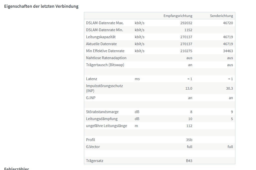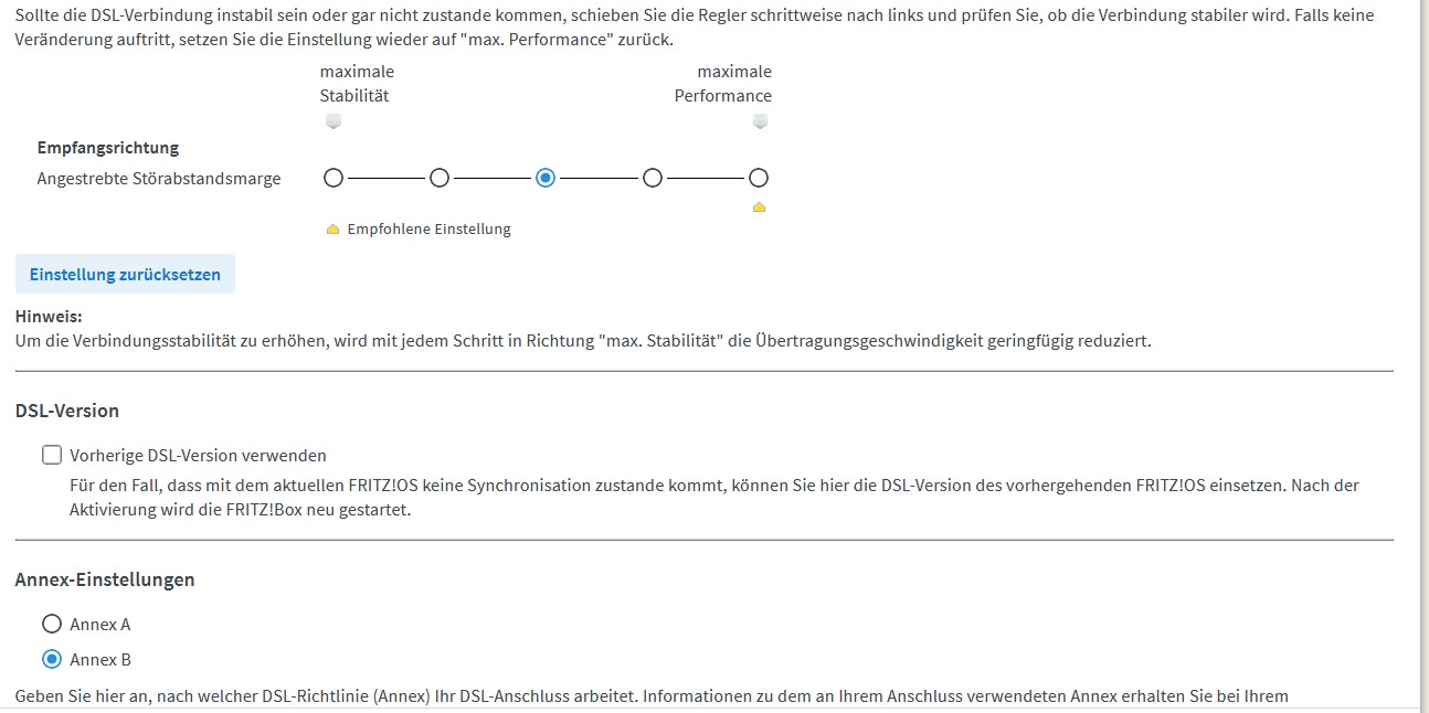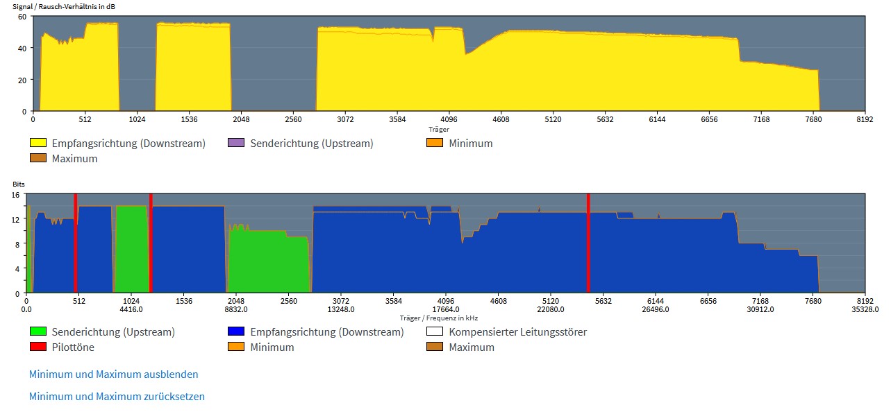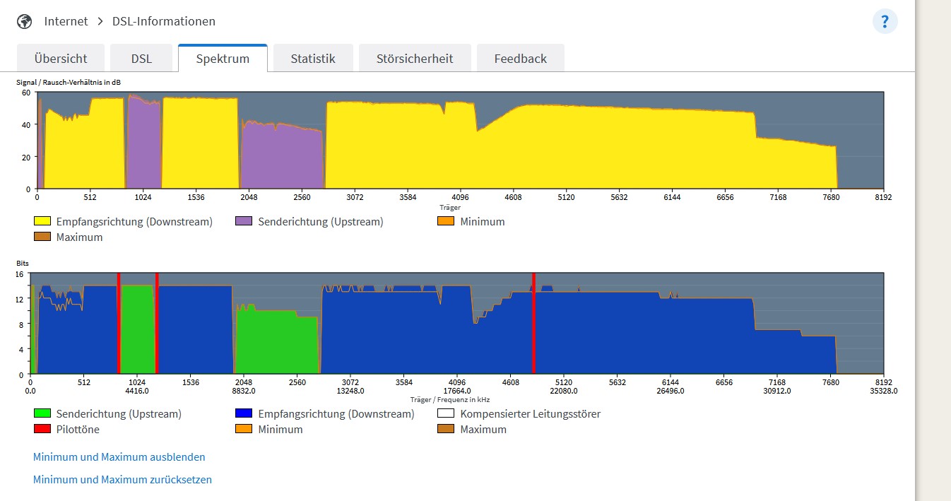 beni_fs schrieb:Geh in deiner Fritz!Box auf Internet DSL-Information und dort Screenshot vom Reiter "DSL" und "Spektrum" (Min/Max-Werte einblenden). Mit den dort angezeigten Werten können die Profis hier im Forum dir sagen ob die Leitung Reserve hat oder grenzwertig läuft.