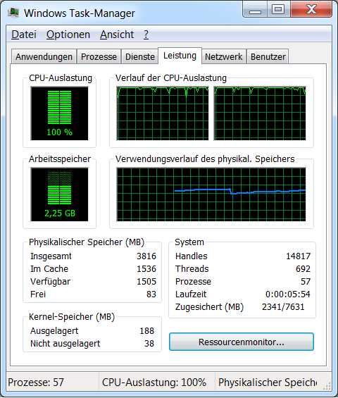 Nun beschwert er sich des Öfteren das der Rechner sich einfach von selbst abschaltet und das Windows 7 zu langsam ist oder überhaupt nicht mehr reagiert, denn das Ganze geschieht einfach nur durch Zufall. Der Task-Manager zeigt mir an das der RAM komplett ausgelastet ist genau wie die CPU auf 100% und das hält einige Minuten an und plötzlich geht die Auslastung wieder runter, aber Windows bzw. der Windows-Explorer ist weiterhin enorm langsam und die ganze Zeit nur am laden -> *Grüner Ladebalken*. Das gleiche Problem tritt auf, wenn er eine Datei löschen möchte, denn das "Recycling" ist ebenso langsam obwohl es z.B. nur eine kleine Datei ist mit ein paar Megabyte und der RAM und die CPU nicht mal ausgelastet sind. Im dritten Screenshot könnt ihr sehen, was geschieht wenn man ein Ordner öffnen möchte.