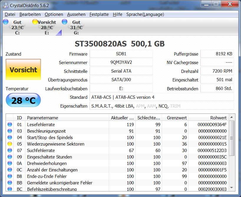 Anmerkung zum Screenshot von CrystalDiskInfo - Es handelt sich um die Backup Festplatte nicht um die Windows Festplatte. Die Backup Festplatte habe ich vorübergehend abgeschaltet. C: = Windows
