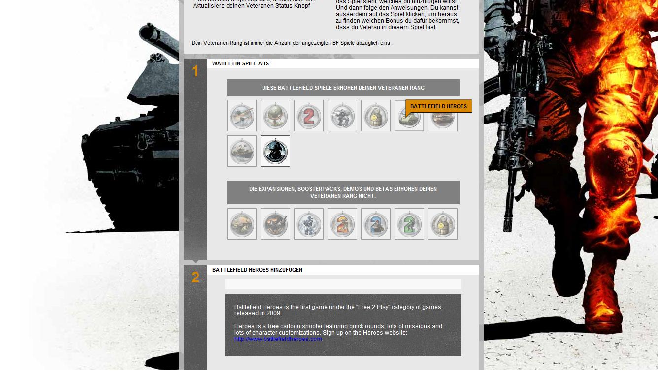 Ich: Ich kenne aber viele, die es irgendwann geschafft haben, dass der Rang stimmt. Auf der Veteranenseite wird mir ja auch angezeigt, dass ich Bad Company 2 besitze. Das Problem ist, dass ich Battlefield Heroes nicht hinzufügen kann. Selbst wenn ein Spiel für den Rang nicht zählen sollte, sollte es mir auf der Seite (also BC2-Homepage und dann auf Veteran) richtig angezeigt werden. Die E-Mail-Adresse/der Account, ... ist bei Heroes gleich. Das Spiel sollte also automatisch auf meiner Veteranenseite dabei sein (man kann ja bei dem Spiel keine Angaben machen).