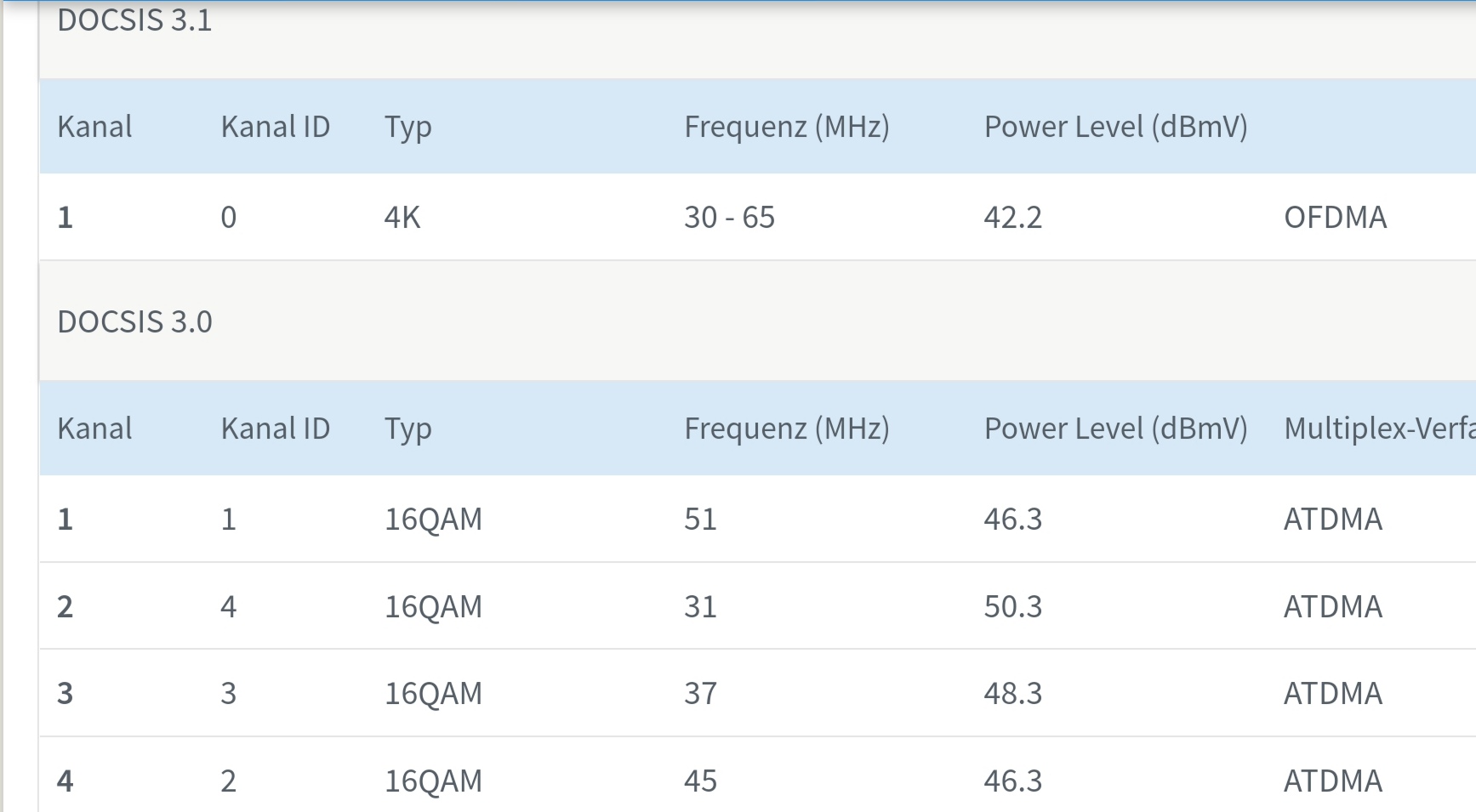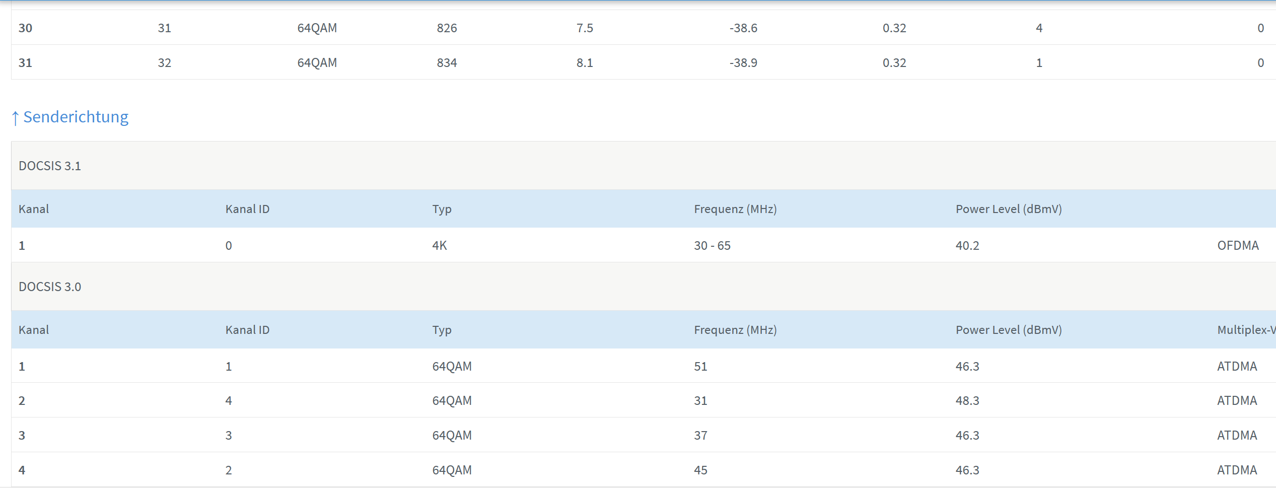 Kanal 3 wechselt ab und zu auf 32QAM. Wahrscheinlich ist der Pegel etwas hoch, aber das sollte passen. Meine Frau hat am Wochenende 13 Stunden Online Konferenz wobei. Sie leitet das Ding, hat also massiven, dauerhaften Upload. Mal schauen was da bei rauskommt.