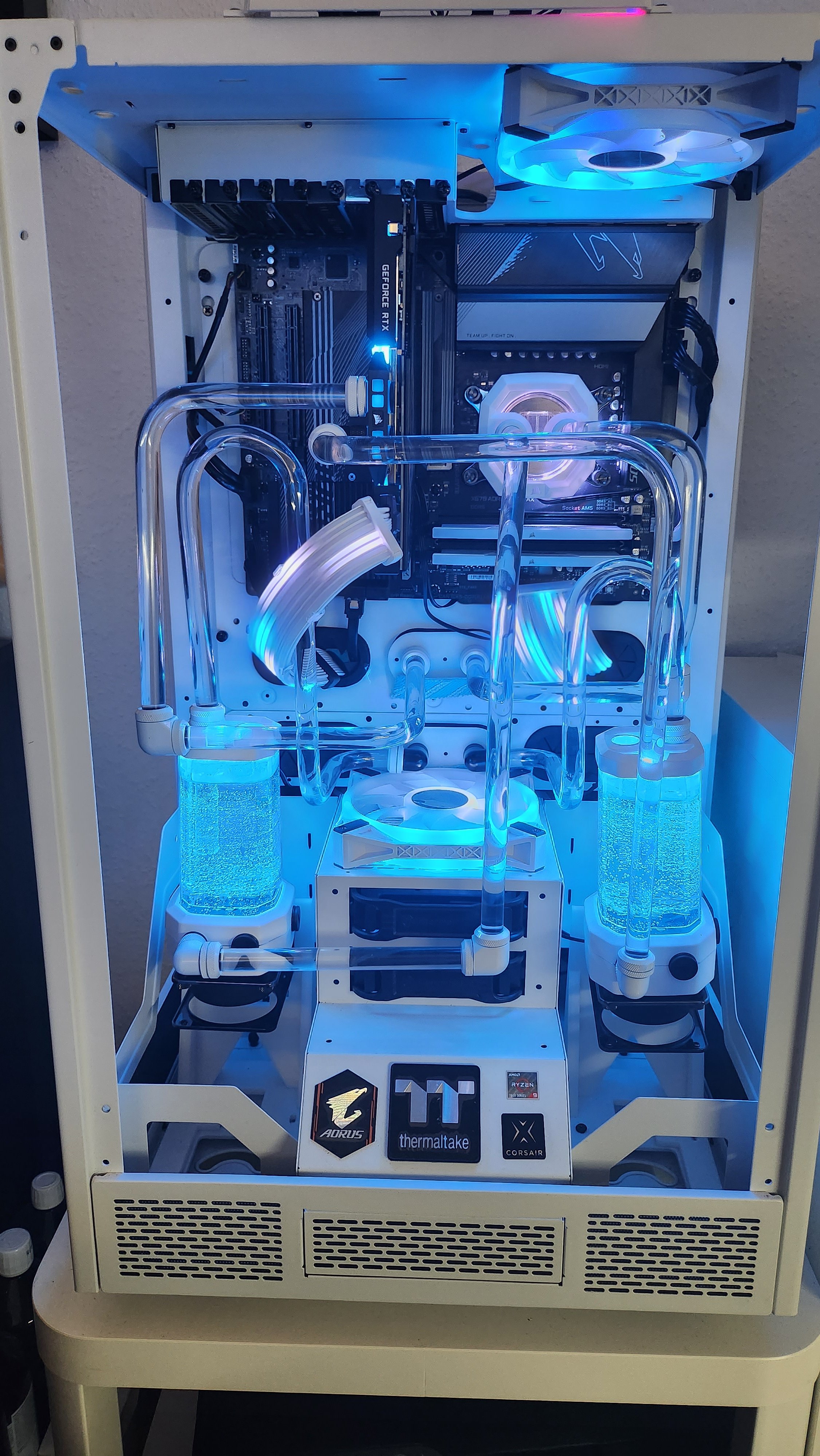 Radiators: Alphacool XT30 560mm (4x Arctic P14 [Push] + 3x Corsair QL120 [Pull]) & XR5 360mm (3xArctic F12 [Push] + 3xCorsair QL120 [Pull])