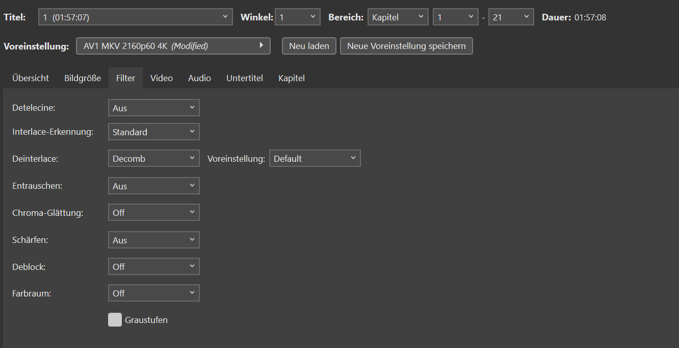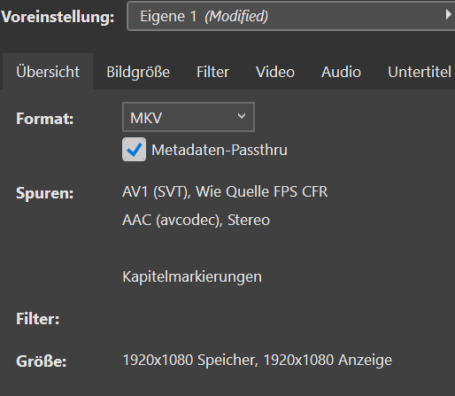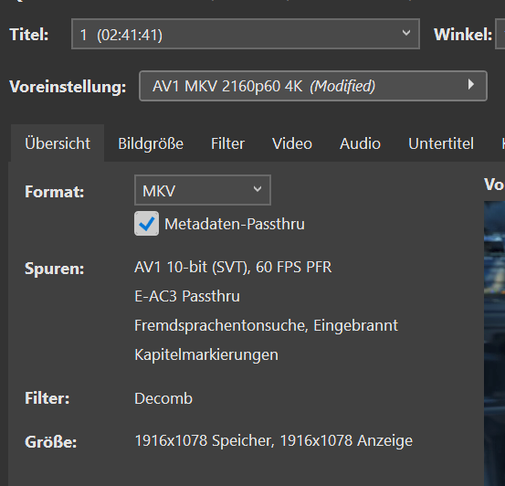 Dann kannst du das Template unter "File->Save Project as Template" und nem passenden Namen, z.B. "MKV AV1 CRF35 P6" speichern. Das kannst du unter "Tools->Settings->Startup->Startup-Template" auch gleich als Standardtemplate einstellen, dann öffnet sich Staxrip immer gleich mit deinem AV1-Template (Standard ist sonst "Automatic Workflow", wo immer x265 benutzt wird).