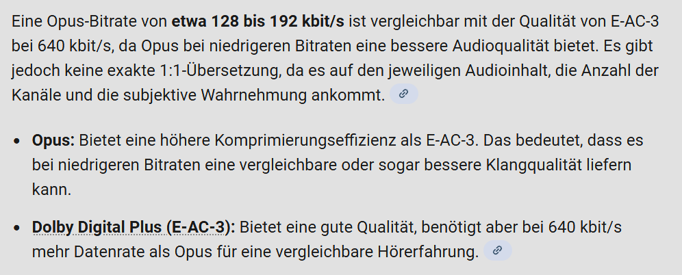 Laut KI sollte in etwa Opus 192 mit EAC3 640 vergleichbar sein, Screenshot anbei. Sollte Dolby Surround nicht 5.1 Channels sein, ist das nicht doppelt?