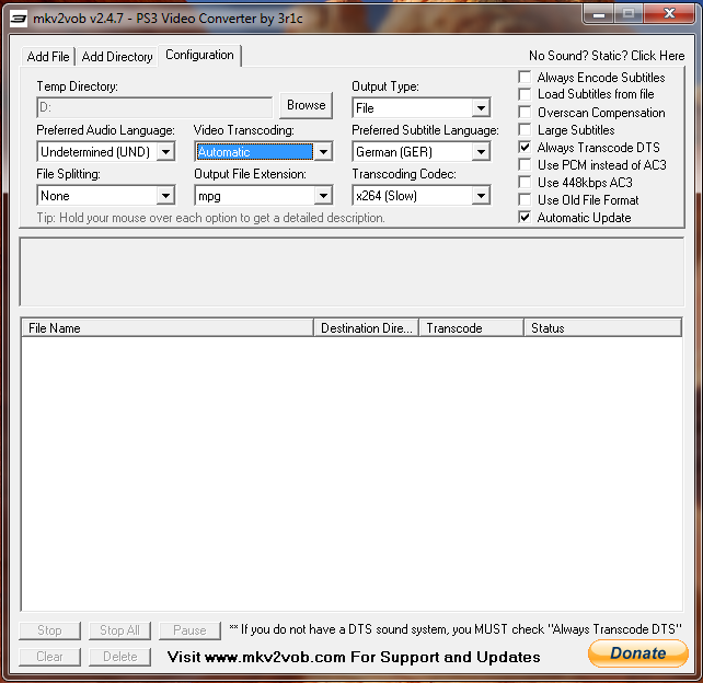 Ich bin auf der Suche nach einem guten Videokonverter der .mkv Filme in ein für die PS3 geeignetes Format konvertieren kann. Nach dem konvertieren soll noch 5.1 Sound in mehreren Sprachen zur Verfügung stehen, außerdem muss der Konverter Videodateien Splitten können da die PS3 Probleme mit Dateien die größer als 4GB sind hat. Und natürlich in 1080p.