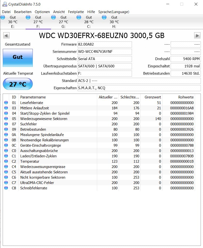 Bei der WD 4TB ist der Rohwert vom Attribut C7 9 und nicht mehr 0, schau mal ob der ansteigt und wenn ja, dann prüfe mal ob beide Stecker des SATA Datenkabels fest sitzen und wenn ja, dann tausche es aus.