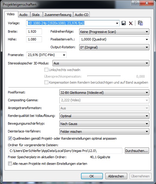 so, jetzt muss ich mich doch mal an euch wenden. Ich habe mit meiner EOS 550d ein Video in 1920x1080 24fps aufgenommen und in Vegas Pro 12 geschnitten. Hier meine Projekt- und Rendereinstellungen: