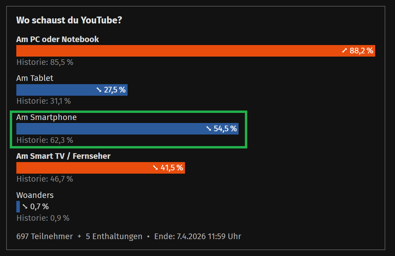 Im Vergleich schaue ich hier und da als mal wen auf Twitch, aber eher weniger, TV quasi null (wobei oft ÖR-Beiträge auf YT), Privatsender null. Die ganzen Hollywood/Serien-Produkte hatten ihren Peak vor 10 bis 20 Jahren, da lockt mich nichts mehr hinterm Ofen vor. Ich könnte massigst jeden Schrott piraten, aber das ist alles nur noch lame und so zahl ich brav GEZ und YT Premium.