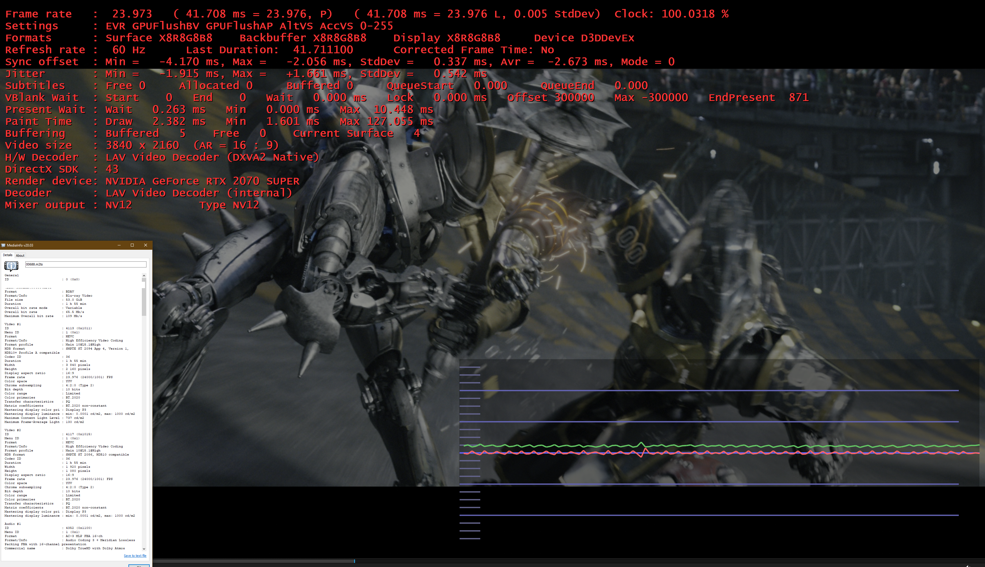 Hab hier ne ts-Datei, irgend so ein Weltraum-Trailer. 4k60, Codec HEVC, Bitrate zwischen 50-70 Mbit/s. Das ist videotechnisch ja schon ein ganz gutes Kaliber. Läuft auf dem PotPlayer (mein "Haupt"-Player), dem VLC und dem MPC-HC butterweich. CPU-Last nicht der Rede wert, GPU (Vega 56) bei ca. 50%.