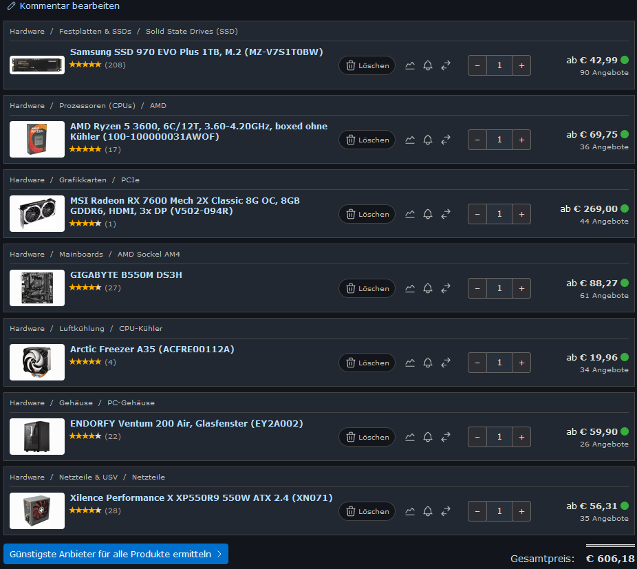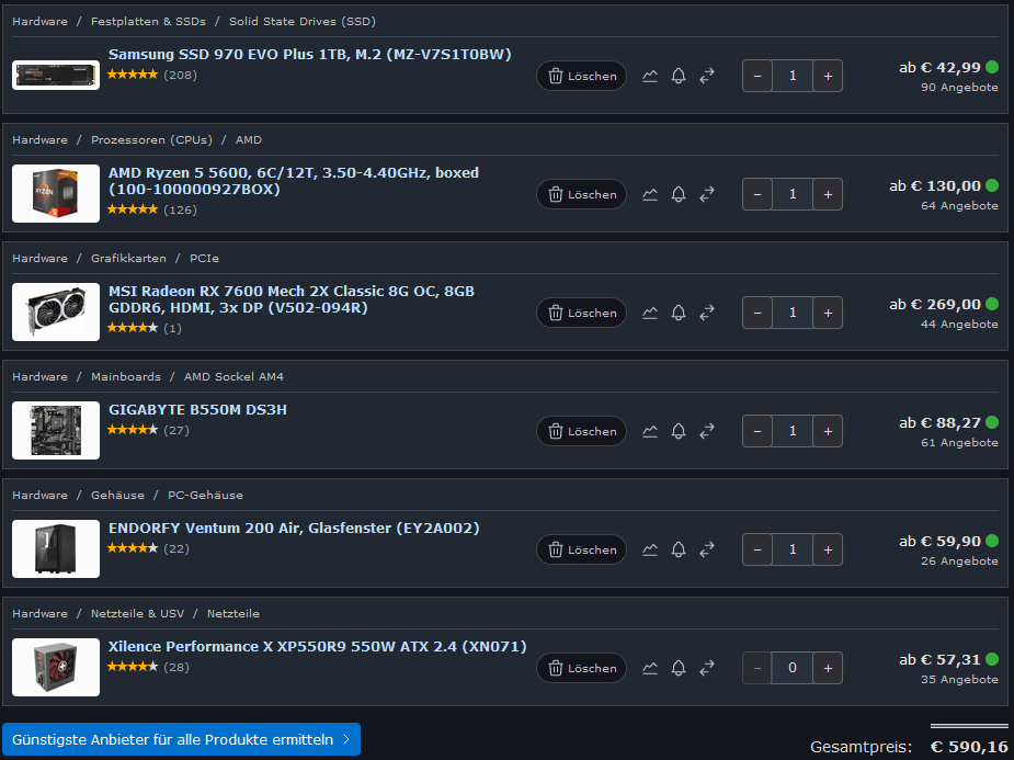Kosten ca. 553 EUR, falls das zu viel ist, kann man an MB (zB. https://geizhals.de/asrock-b550m-pro4-a2298943.html?hloc=at&hloc=de) und/oder GPU noch sparen.