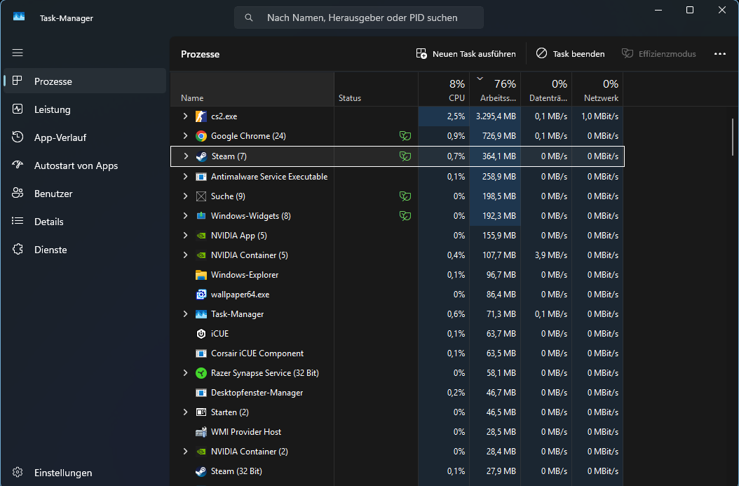 qiller schrieb:RAM ist voll -> Auslagerung. Ich wusste gar nicht, dass CS2 so RAM lastig ist. Oder du hast jede Menge Krempel im Hintergrund laufen, der dir deinen RAM klaut. Poste mal Taskmanager Prozessliste sortiert nach RAM-Auslastung.