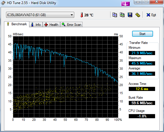 Die Transferrate ist gewohnt langsam für IDE Platten (deine SATA dürfte da locker 3mal schneller sein), jedoch ist zum starten des Betriebssystems eher die Zugriffszeit entscheidend, da hier viel kleine Dateien geladen werden müssen.
