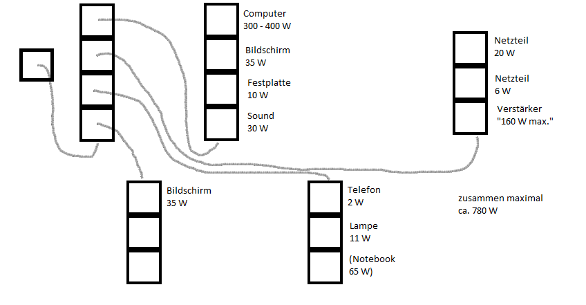 ich wusste nicht, in welches Forum ich das am besten schreiben soll. Es hat auf jeden Fall mit Energieversorgung zu tun. Im Anhang seht ihr, wie es zur Zeit bei mir im Zimmer (leider nur eine Steckdose) zugeht. Die Vierecke sind Steckdosen, ganz links ist die einzige Wandsteckdose, der Rest sind Mehrfachstecker.