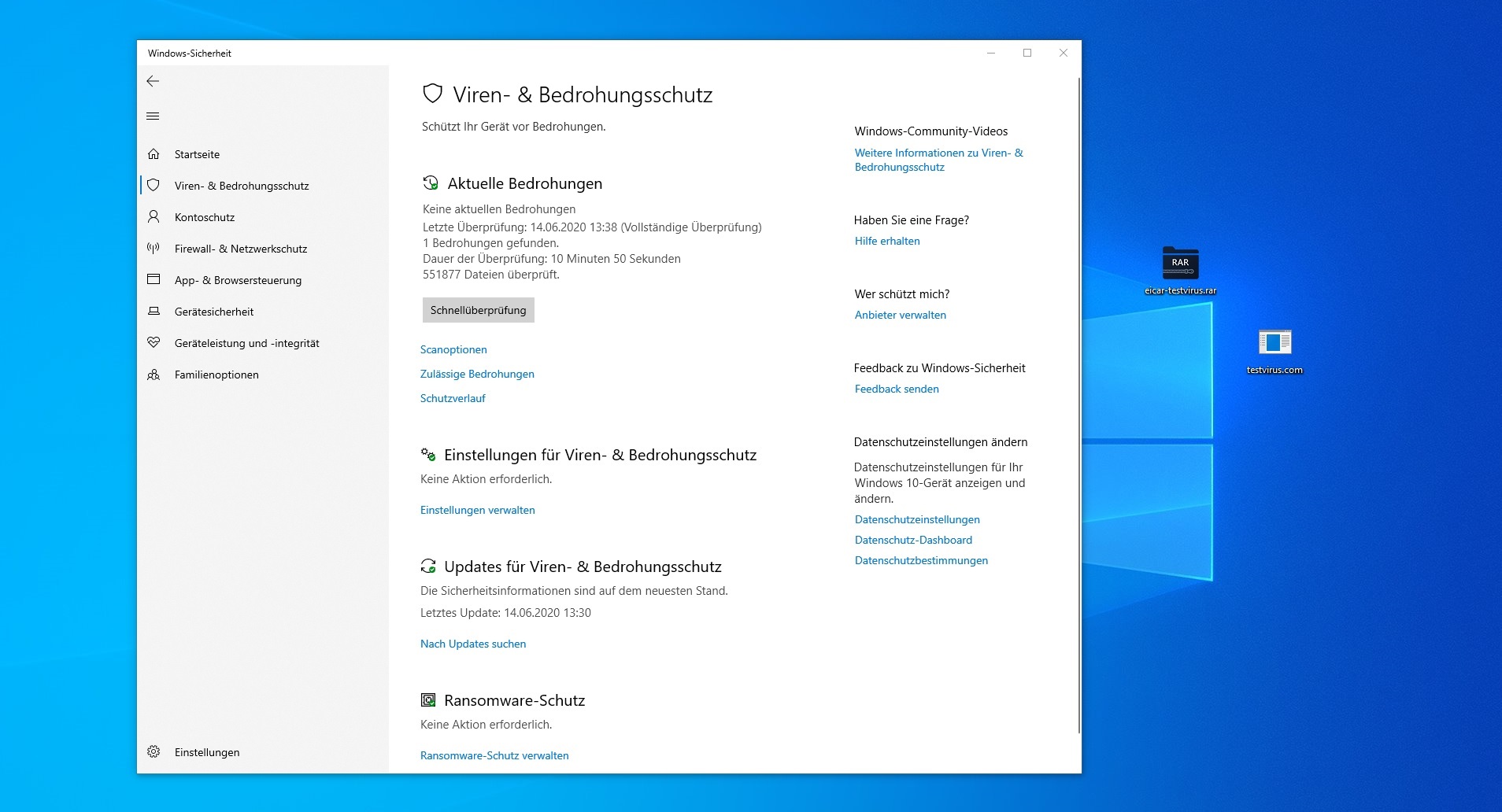 Dann eine Windows Defender Schnellüberprüfung gestartet und er hat auch die "Eicar-Zip" als