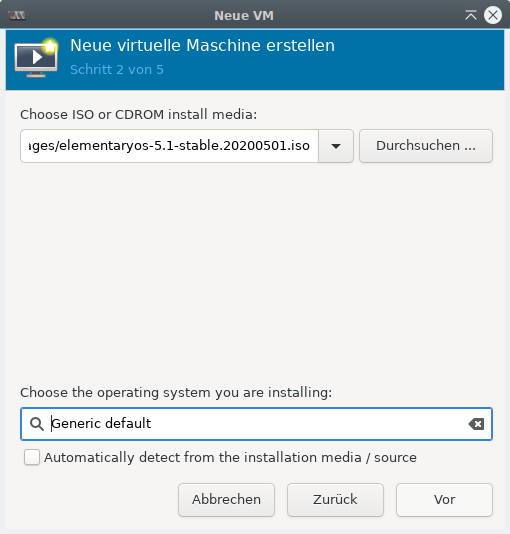 Im nächsten Fenster wählen sie, falls sie Lokales Installationsmedium ausgewählt haben, ihr Iso Installationsmedium aus. Sollte ihr Betriebsystem in der Auswahl unten nicht vefügbar sein, wählen sie einfach Generic Default.