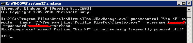 C:\Program Files\Oracle\VirtualBox\VBoxManage.exe guestcontrol "Win XP" execute --image ""C:\Program Files\Mozilla Firefox\firefox.exe" --username vboxuser --password vboxpass --environment "DISPLAY=:0.0"
