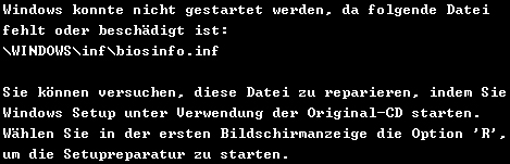 Wenn ich eine bestehende virtuelle Maschine starten möchte bekomme ich folgende Fehlermeldung, dass die biosinfo.inf-Datei beschädigt sei (s. Screenshot).