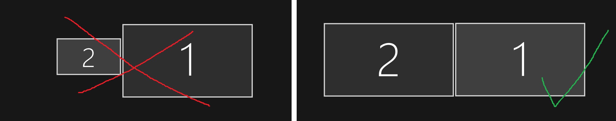 Edit: Ich habe es in einem Bild nochmal visualisiert was ich mit "gleichgroß" meine. Die Bildschirme sollen in den Anzeigeeinstellungen so aussehen ohne, dass ich die Auflösung vom Hauptbildschirm herunterschraube und ohne dass die Skalierung vom Zweitbildschirm falsch ist. Vielleicht hat ja jemand eine andere Lösung außerhalb der Treibereinstellungen.